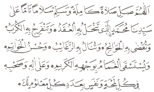 "Allahumme salli salâten kâmileten ve sellim selâmen tâmmen alâ-seyyidina Muhammedin ellezi tenhallü bihi’l ‘ukadu ve tenfericu bihi’l-kürabu ve tukdâ bihi’l-havâicu ve tünâlü bihi’r-rağâibu ve husnu’l-havâtimi ve yusteska’l-ğamâmu bi-vechihi’l-kerîmi ve ‘alâ âlihi ve sahbihi fî-külli lemhatin ve nefesin bi-‘adedi külli ma’lûmin lek."